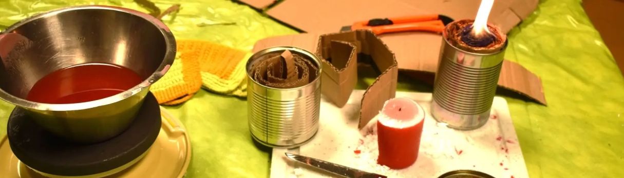 In dem Moment kommt die einfache wie geniale Erfindung der „Konservenkerzen“ oder „Dosenkerzen“ ins Spiel. Mit einem Kilo Wachsreste können fünf Konservendosen mit flüssigem Wachs und Pappstreifen so befüllt werden, dass sie als Brennstoff zum Kochen genutzt werden können.
