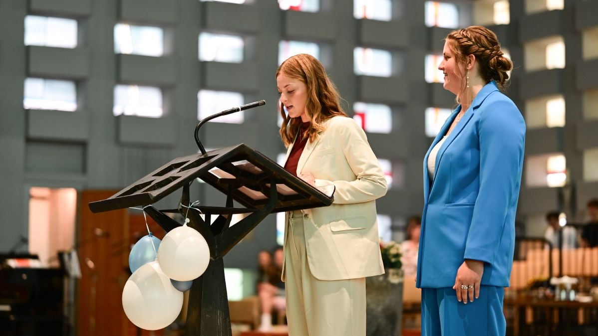 Die Abiturientinnen Carolin Ademmer und Emmi Pauly – als Vertreterinnen des Abiturjahrgangs – bedankten sich ebenso bei ihrer Stufenleitung, dass sie unter „eurem Regenschirm“ stehen konnten und zollten Frau Weiland als Schulleitung ihren besonderen Respekt. Mit einem Augenzwinkern erinnerten sie an besondere Momente der vergangenen Oberstufe wie die Stufenfahrt und bedankten sich ebenso herzlich bei ihren Eltern.