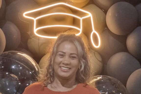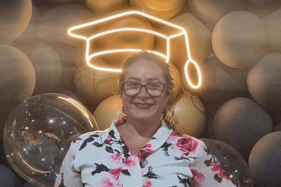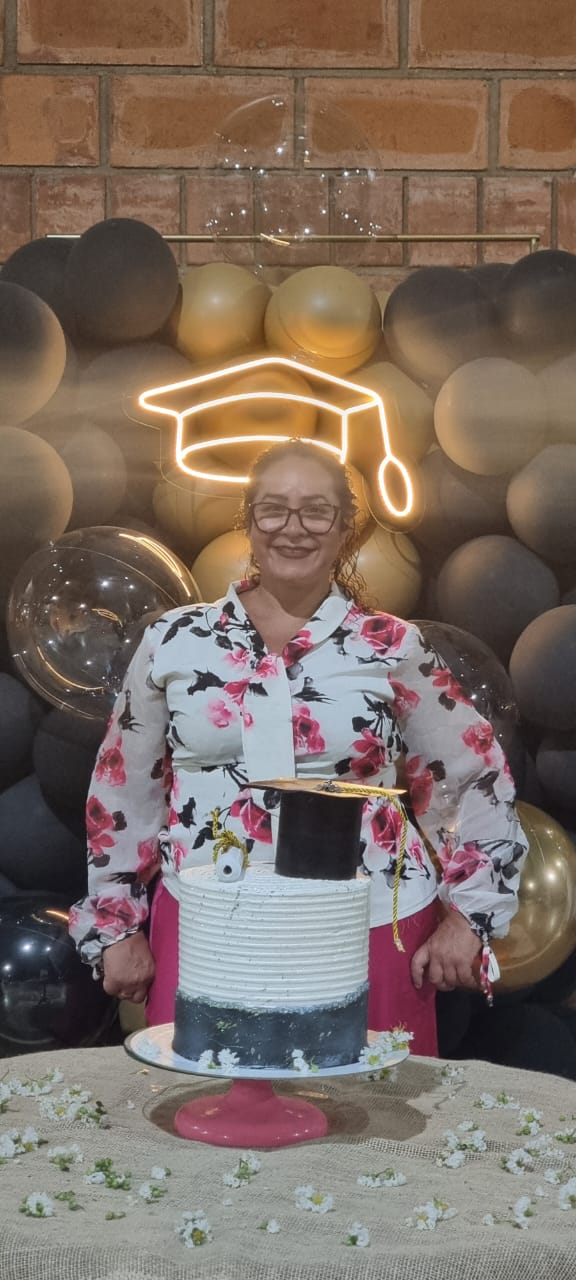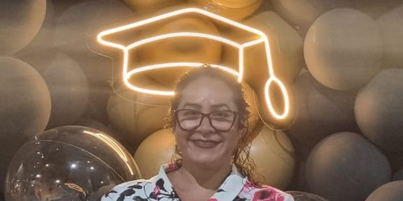 Glänzende Augen und ein strahlendes Lächeln zeigt uns diese frisch gebackene Bäckerin mit einem Doktorhut aus Licht!