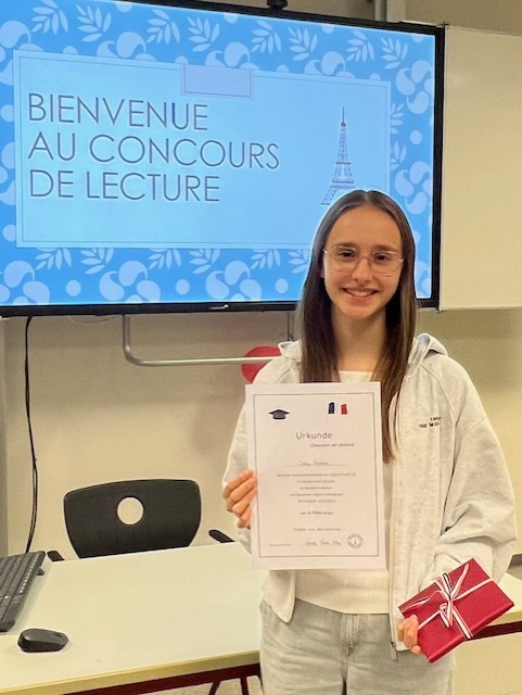 Unsere Schule wurde in diesem Jahr durch Francis aus der Jahrgangsstufe 8 für das erste Lernjahr Französisch und durch Julia aus der Jahrgangsstufe 10 für das zweite und dritte Lernjahr vertreten. Beide Schülerinnen haben sich sehr gut auf den Wettbewerb vorbereitet und trafen auf eine starke Konkurrenz. Julia gelang es sogar, den ersten Platz für ihre Niveaustufe zu gewinnen. Sie zeigte eine besonders starke Leistung beim Vorlesen des unbekannten Texts.