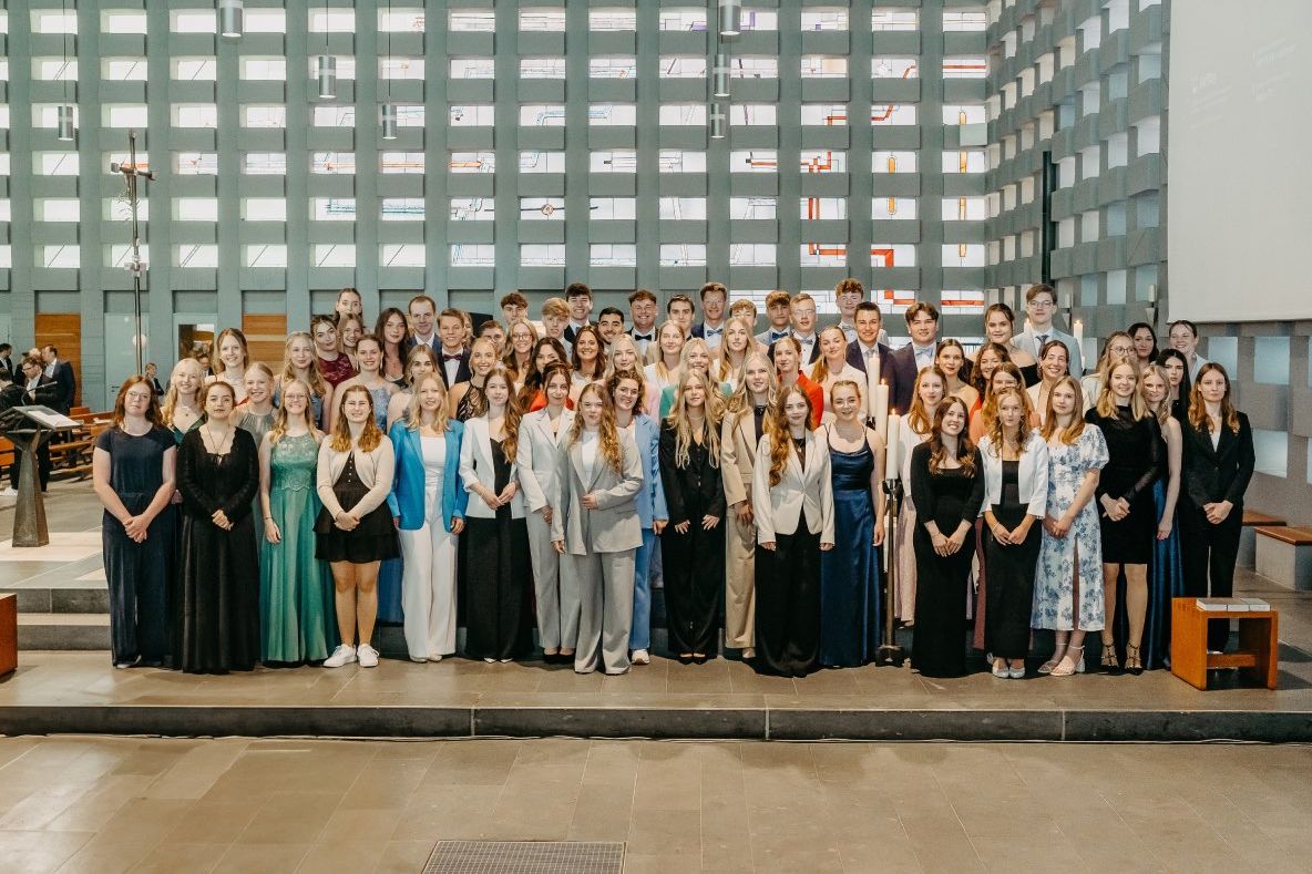 68 Abiturientinnen und Abiturienten feierten gemeinsam mit ihren Familien und dem Lehrerkollegium den von Pastor Hagedorn und Pastoralreferentin Vera Naber zelebrierten Gottesdienst. Der Projektchor – unter der engagierten Leitung von Andrea van der Linde – gestaltete sowohl während der Messe als auch im weiteren Verlauf des Festaktes den musikalischen Rahmen. Einige Solisten boten musikalische Höhepunkte: Nina Vinkelau spielte auf dem Klavier Ludovico Einaudis Nuvole bianche, Herman Kosmann (ebenfalls auf dem Klavier) Yasuaki Iwata: Kass‘ Theme – The Legend of Zelda, und Pia Karthaus wurde bei der Siciliana und dem Allegro aus der Sonate F-Dur für Blockflöte op. 1 Nr. 11 von G.F. Händel von Andrea van der Linde auf dem Klavier begleitet.
