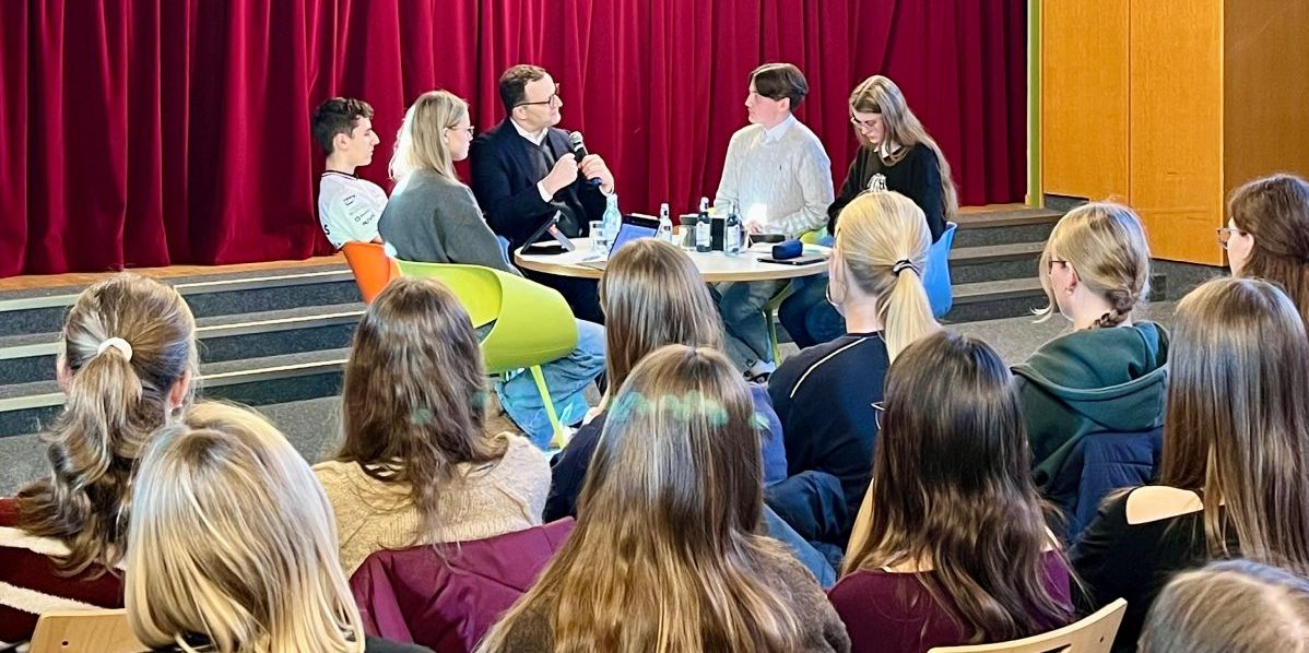 In einer 60-minütigen Gesprächsrunde, die von vier Schüler*innen der Q1 moderiert wurde, stellte er sich den (kritischen) Fragen der Jahrgangsstufe Q1.